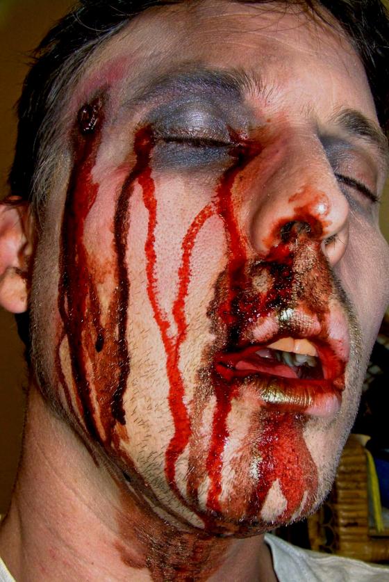 Note bleeding from orifices. Replicating small caliber gunshot wound to the head. and ecchymosis(bruising) in the soft tissues. This is strictly make-up I did on myself in prep for a shoot.