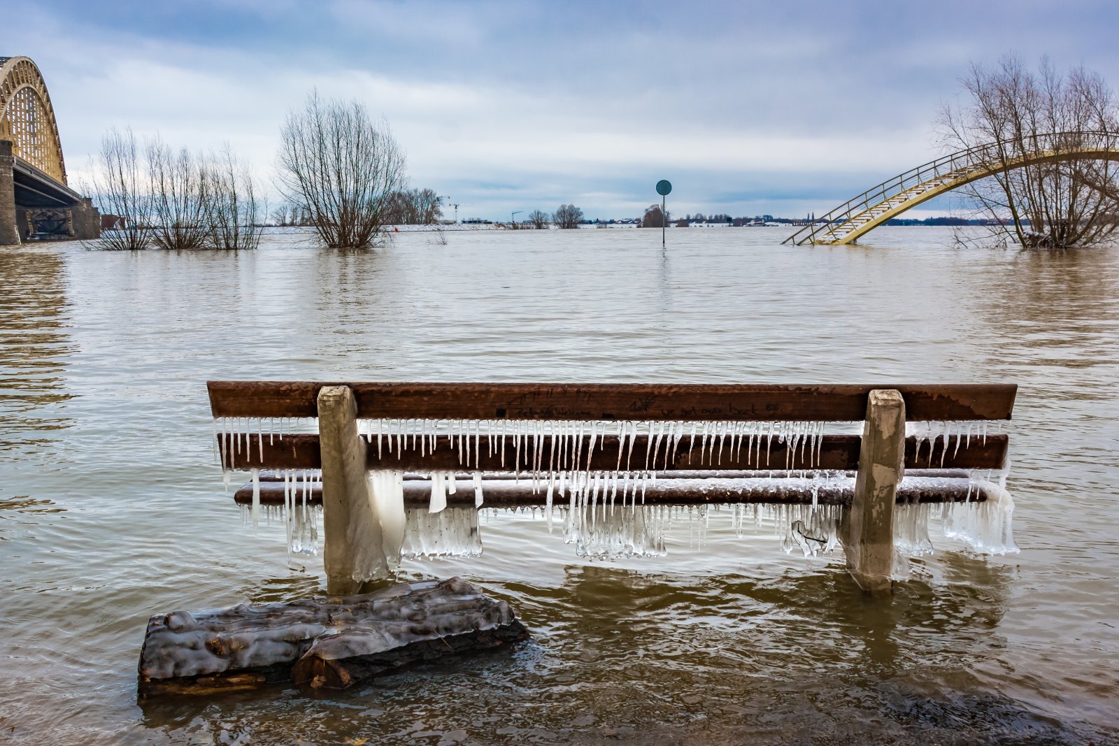 I took this photo last February on the bank of the river Waal in Nijmegen. The water was extremely high, as you can see the bridge is out of order. Then it started to freeze severely...... It turned out to be a great combination. Take a seat and enjoy.